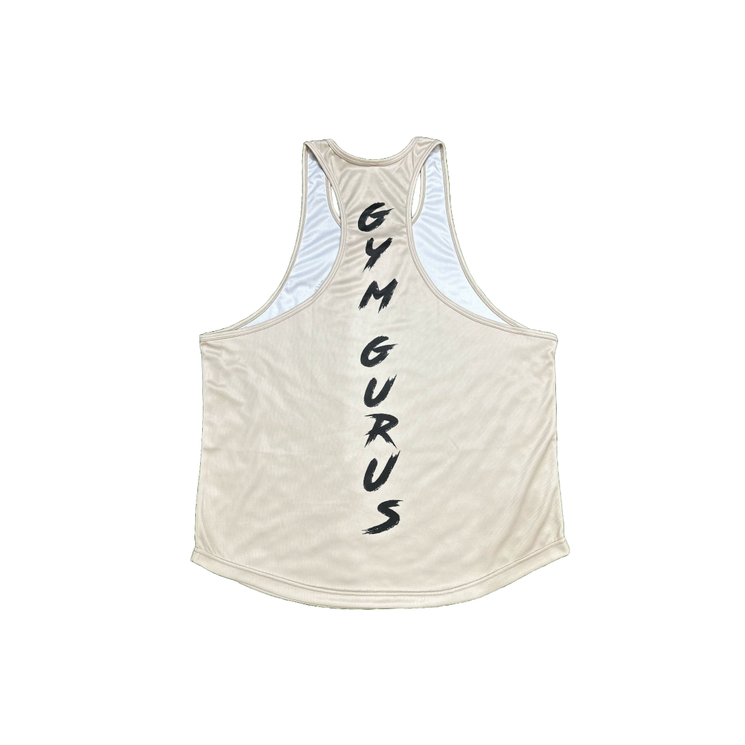 Its lightweight, stretchy, and durable build moves with you through every rep while holding up to your grind. Featuring a sleek black Gym Gurus logo on the chest and a bold vertical logo down the back, this neutral color-way brings calm energy and focused intent to your training fit.
